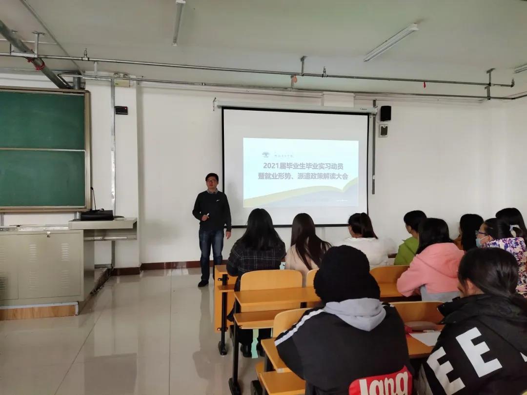 为了使2021届毕业生更好的了解就业形势,扎实推进2021届毕业生实习工作顺利开展,beats365官方网站于11月4日上午8:30在崇文楼B401举办2021届毕业生毕业实习动员暨就业形势、派遣政策解读大会。出席本次动员大会的有beats365官方网站副经理王英利、团学办公室主任张迪及2017级全体毕业生。
