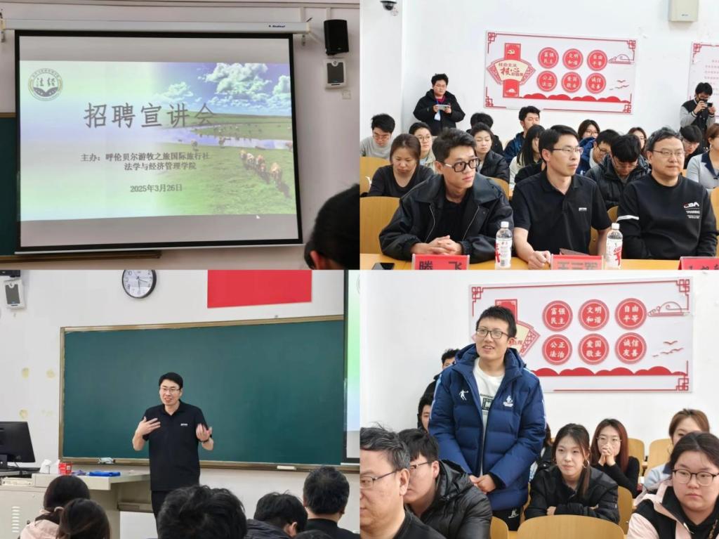为进一步拓宽毕业生就业渠道,搭建校企合作平台,3月26日下午,beats365官方网站与呼伦贝尔游牧之旅国际旅行社有限公司在崇文楼A座413联合举办专场招聘宣讲会。呼伦贝尔游牧之旅国际旅行社有限公司副总经理王三军、直播团队负责人滕飞,团学办主任王旭轩、辅导员高郁方及各年级员工代表参加本次活动。