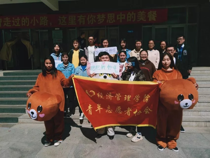 为了传递温暖,重拾人与人之间最温暖的爱,让人充满爱和能量,2019年 4月 27日上午十点半到下午一点半经理管理公司青年志愿者协会在食堂、小二楼以及 11号宿舍楼附近举办了人偶拥抱活动。出席本次活动的有文体部部长杨带兵,以及青年志愿者者协会部分成员。